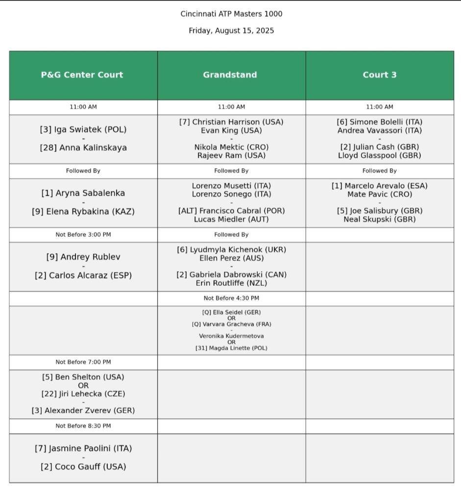 In campo anche i quarti di finale del doppio maschile, dove saranno due le coppie azzurre impegnate: Musetti/Sonego affronteranno Cabral/Miedler, mentre Bolelli/Vavassori se la vedranno con Cash/Glasspool.