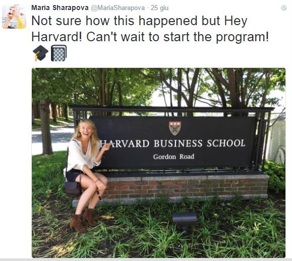 Capolavoro comunicativo della russa: le è bastato associare il suo nome alla prestigiosa Università di Harvard per ottenere una certa risonanza mediatica. La notizia in sé ha poco valore: si tratta di un paio di settimane e nemmeno il suo manager ha saputo dire che tipo di certificazione riceverà. Però ha raccolto 13.000 like e 3.500 condivisioni su Twitter! Riesce a far parlare di sé in qualsiasi momento, anche quando è lontanissima dal tennis giocato. Nel primo giorno di Wimbledon (sarà stato un caso?) ha pubblicato un post su Twitter (che ha fruttato 13.000 like e 3.500 retweet) in cui manifesta la sua gioia per essere entrata nella prestigiosa Università di Harvard. “Non so bene come sia successo, ma…Hey Harvard! Non vedo l’ora di iniziare il programma!”. Dopo la squalifica di due anni inflitta dal Tribunale ITF, Maria è in attesa dell’esito del ricorso presentato presso il CAS di Losanna (la sentenza arriverà entro il 18 luglio) e si sta allenando piuttosto intensamente.