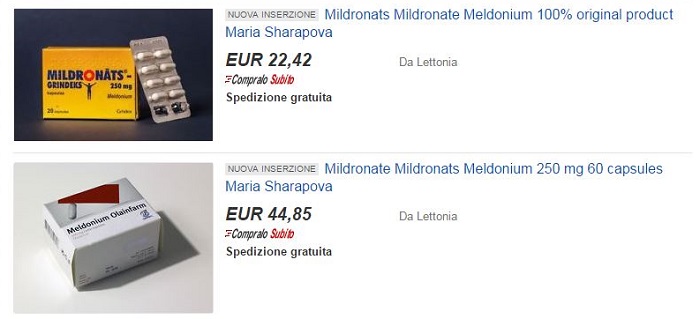 Le vie del business sono infinite. Dopo l'annuncio della positività di Maria Sharapova, la russa è diventata…testimonial a sua insaputa! il Mildronate è diventato il medicinale più famoso al mondo. Per questa ragione, chi lo vende ha fiutato l'affare e ha trovato un modo originale per proporlo: se fate un salto su Ebay e mettete la parola chiave "Mildronate", troverte le celeberrime compresse a vari prezzi, sia la scatola gialla (con in bella evidenza il nome della Grindeks), sia quella bianca con la scritta in viola. La cosa divertente è che in decine di annunci è menzionato il nome di Maria Sharapova, come se il fatto che la tennista lo abbia utilizzato sia un incentivo a comprarlo. Altro che caramelle Sugarpova… Le vie del business sono infinite. Dopo l'annuncio della positività di Maria Sharapova, la russa è diventata…testimonial a sua insaputa! il Mildronate è diventato il medicinale più famoso al mondo. Per questa ragione, chi lo vende ha fiutato l'affare e ha trovato un modo originale per proporlo: se fate un salto su Ebay e mettete la parola chiave "Mildronate", troverte le celeberrime compresse a vari prezzi, sia la scatola gialla (con in bella evidenza il nome della Grindeks), sia quella bianca con la scritta in viola. La cosa divertente è che in decine di annunci è menzionato il nome di Maria Sharapova, come se il fatto che la tennista lo abbia utilizzato sia un incentivo a comprarlo. Altro che caramelle Sugarpova…