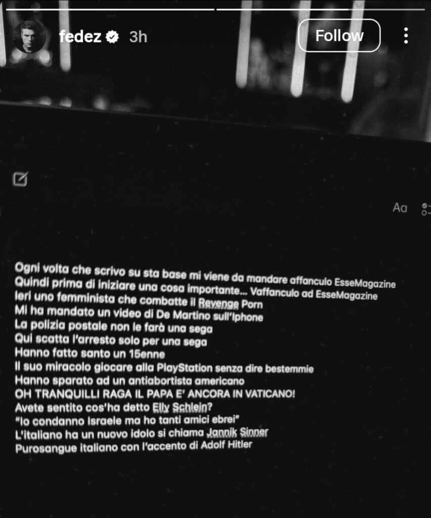 Nuovo attacco frontale ai danni di Jannik Sinner, che stavolta vede recapitarsi un vero e proprio dissing ad opera del cantante rapper Federico Lucia, in arte Fedez. Tramite il proprio profilo Instagram, l’artista ha reso pubblico un estratto di un pezzo che deve essere ancora pubblicato, e nelle ultime battute compare proprio il nome dell’altoatesino. “L’italiano ha un nuovo idolo si chiama Jannik Sinner, purosangue italiano con l’accento di Adolf Hitler”, queste le dure strofe che Fedez ha lanciato ai danni del numero due del mondo, calcando decisamente la mano.