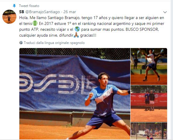 "Ciao, mi chiamo Santiago Bramajo, ho 17 anni e vorrei arrivare ad essere qualcuno nel tennis. Nel 2017 sono stato il numero 1 nella classifica nazionale e ho ottenuto il mio primo punto ATP. Adesso ho bisogno di viaggiare per il mondo per raccogliere altri punti. CERCO SPONSOR, qualsiasi aiuto è utile, per favore, diffondete, grazie!!!"