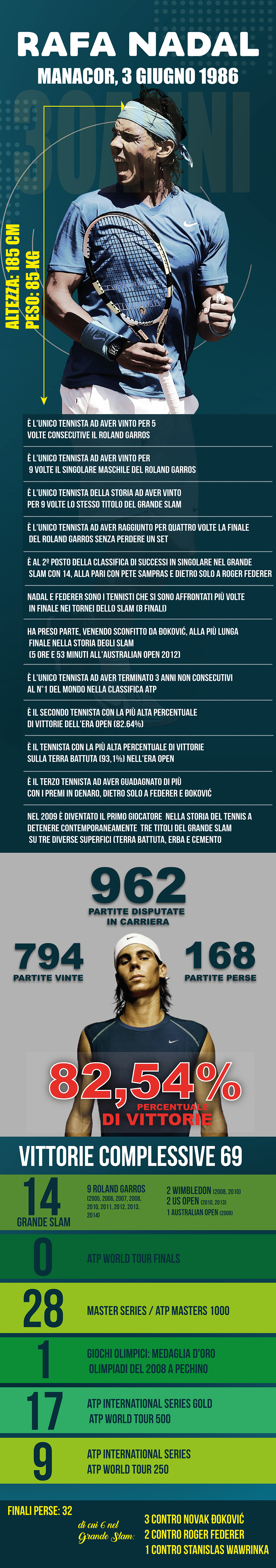 Nel giorno del trentesimo compleanno di Rafael Nadal, assente nelle semifinali del suo Roland Garros per il secondo anno consecutivo, una magnifica infografica ne celebra tutti i traguardi raggiunti in una carriera straordinaria. Con la speranza che tanti numeri vadano presto ritoccati.