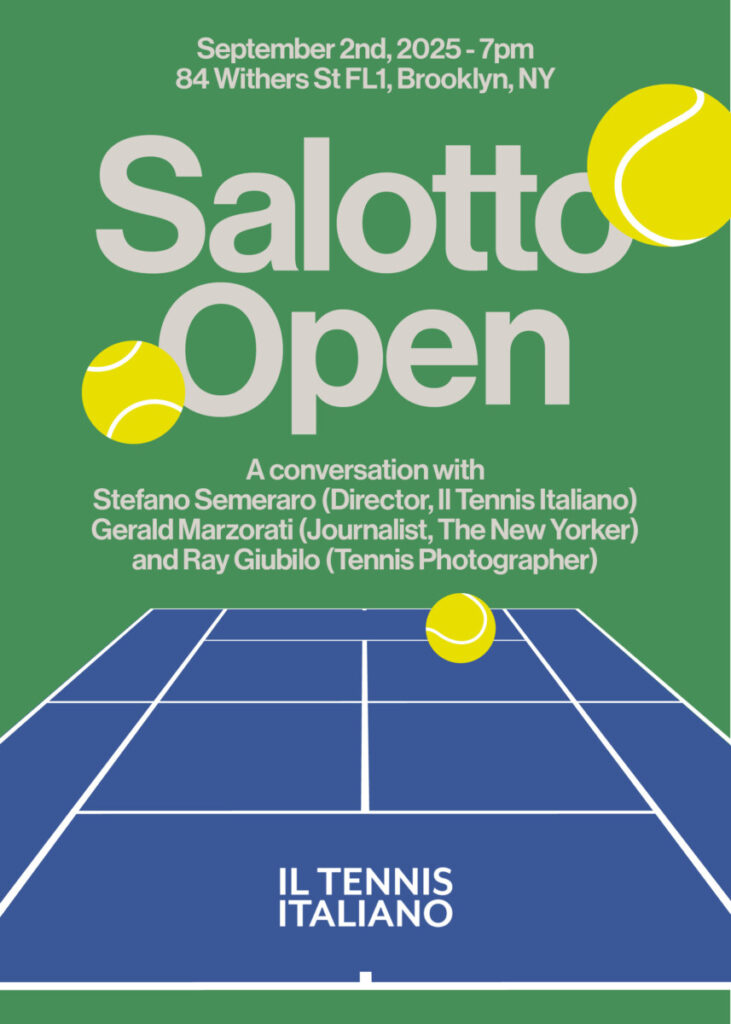 Stefano Semeraro, Ray Giubilo, lo scrittore ed editor del New York Times Gerald Marzorati, introdotti dall’illustratore e padrone di casa Emiliano Ponzi, dialogheranno presentando l’iniziativa a un pubblico selezionato di appassionati, durante lo Us Open, in una cornice creativa e di tendenza, in piena sintonia con lo spirito della rivista.