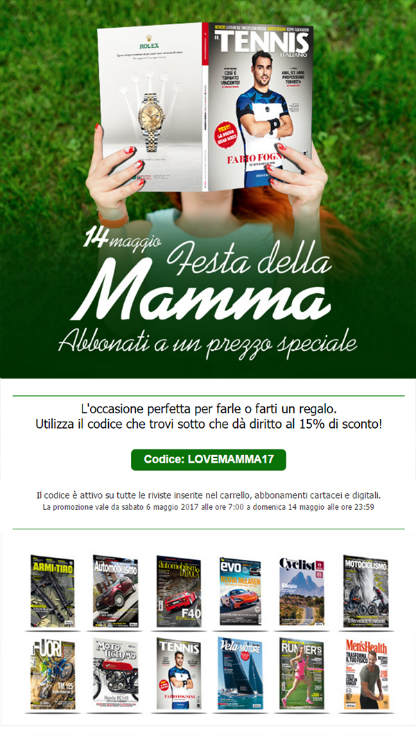 Domenica 14 maggio è il giorno del via del tabellone principale degli Internazionali d’Italia, ma anche la Festa della Mamma. L'occasione perfetta per farle o farti un regalo. Utilizza il codice che trovi all’interno, che dà diritto al 15% di sconto sull’abbonamento annuale a Il Tennis Italiano.
