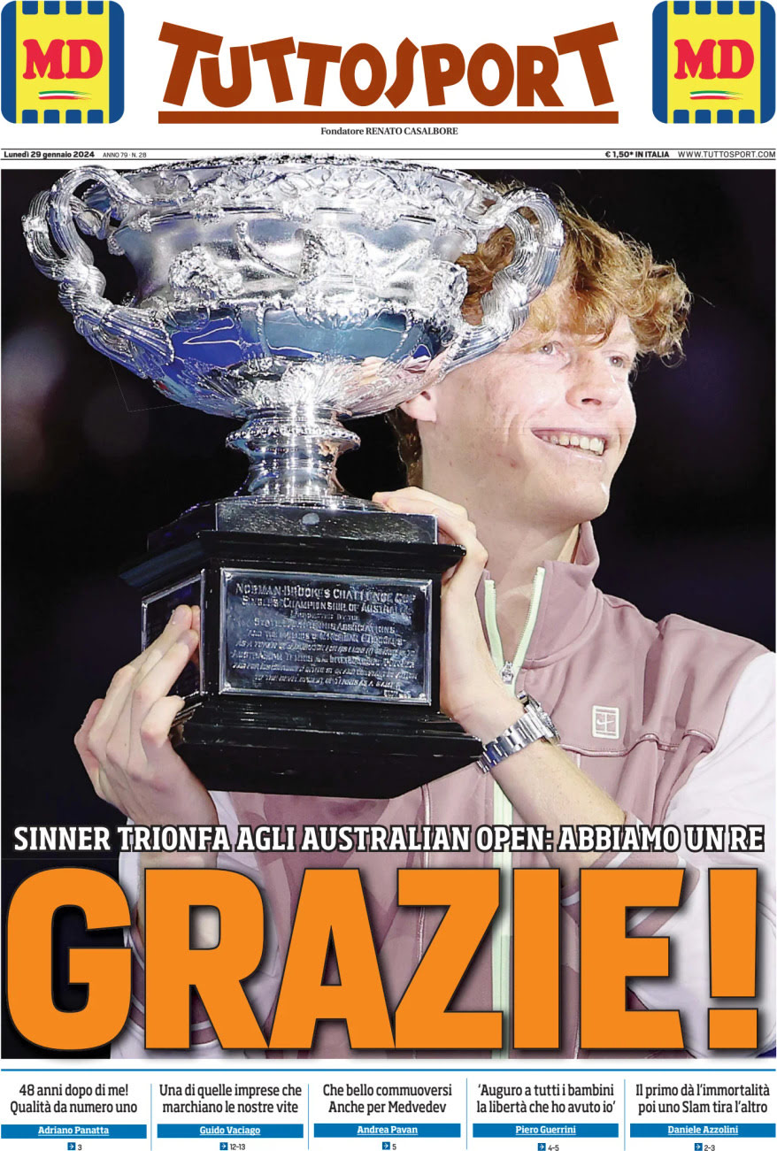 Un successo che ha superato ogni confine. Jannik Sinner ha vinto gli Australian Open 2024 e ha riportato l’Italia a trionfare in uno Slam dopo quasi 48 anni. Una vittoria che inevitabilmente ha avuto una risonanza eccezionale, sia in Italia che all’estero su tutti i quotidiani cartacei e online. La Gazzetta dello Sport ha titolato “Il ragazzo d’oro”, concedendo le prime 13 pagine come approfondimento a questa vittoria. “Dell’altro mondo” il titolo del Corriere dello Sport, sottolineando la qualità degli avversari battuti da Sinner per arrivare al trionfo: sono ben 15 le pagine occupate dall’altoatesino. Un “Grazie” a tutta pagina per Tuttosport con scritto nell’occhiello “abbiamo un re”.