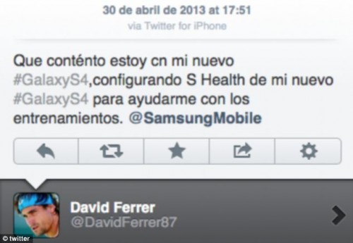 Curiosa gaffe di David Ferrer. Lo spagnolo, numero 4 ATP, è testimonial Samsung ed è tra i più fervidi utilizzatori di Twitter. Nelle scorse settimane, ha fatto scalpore il lancio del nuovo Smartphone Samsung Galaxy S4, risposta sempre più incisiva nei confronti dell'IPhone Apple. Il 30 aprile, mentre era impegnato all'Estoril, ha twittato un elogio al nuovo prodotto, dicendo di aver configurato il programma S Health "per aiutarsi con gli allenamenti". Peccato che il tweet sia partito da un IPhone, come testimonia inequivocabilmente l'immagine qui sotto…. Lo spagnolo, numero 4 ATP, è testimonial Samsung ed è tra i più fervidi utilizzatori di Twitter. Nelle scorse settimane, ha fatto scalpore il lancio del nuovo Smartphone Samsung Galaxy S4, risposta sempre più incisiva nei confronti dell'IPhone Apple. Il 30 aprile, mentre era impegnato all'Estoril, ha twittato un elogio al nuovo prodotto, dicendo di aver configurato il programma S Health "per aiutarsi con gli allenamenti". Peccato che il tweet sia partito da un IPhone, come testimonia inequivocabilmente l'immagine qui sotto….