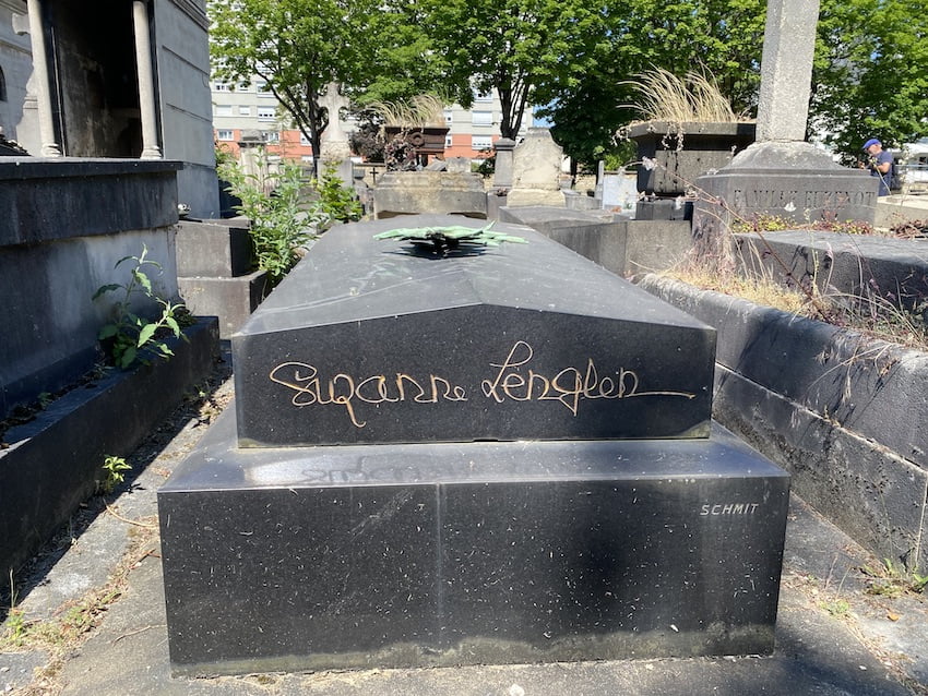 La Divina del tennis, morta giusto 85 anni fa, la prima donna atleta davvero capace di smuovere le masse, fare attendere i reali e giocare con i divi di Hollywood, riposa in questa periferia sgarrupata e grigia. Non ci sono fiori vicino alla tomba, nessun segno che testimoni una visita, un pensiero. (Al Père Lachaise, invece, per Jim Morrison, trovi un bric a brac in continuo aggiornamento di bottiglie di whisky, copertine di vinili, fotografie…).