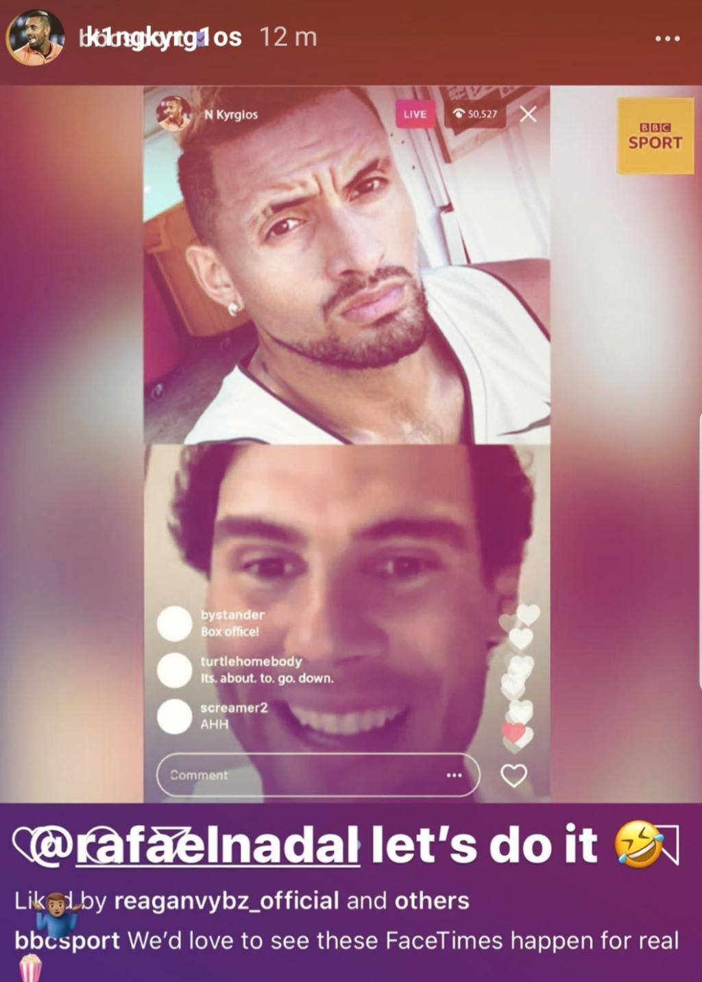 Tutto nasce da una simpatica proposta della BBC Sport, che sempre sui social ha messo assieme le facce dei due tennisti, come ad emulare una vera e propria videochiamata: “Ci piacerebbe che questo avvenga sul serio”, ha scritto la testata britannica ‘accoppiando’ anche Cristiano Ronaldo e Lionel Messi. La risposta di Kyrgios si è fatta attendere solo qualche ora: “Rafa, facciamo una diretta Instagram insieme”, si legge su una Stories dell’australiano. La palla passa in mano allo spagnolo. Accetterà?