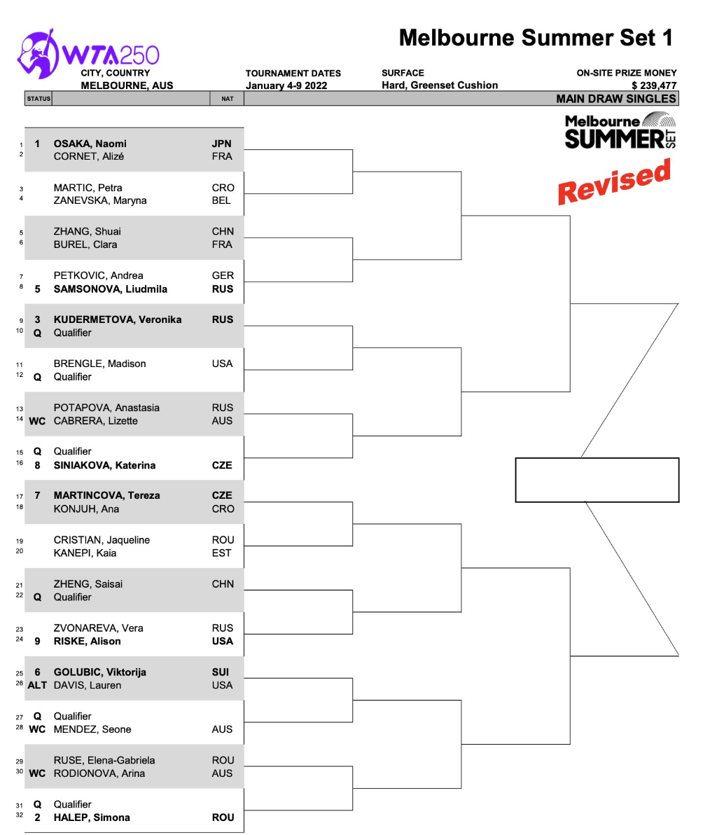 È stato sorteggiato il tabellone principale del Melbourne Summer Set 1, torneo in programma dal 4 al 9 gennaio. Dopo la rinuncia di Camila Giorgi, entra in tabellone Lauren Davis, che affronterà Viktorjia Golubic.