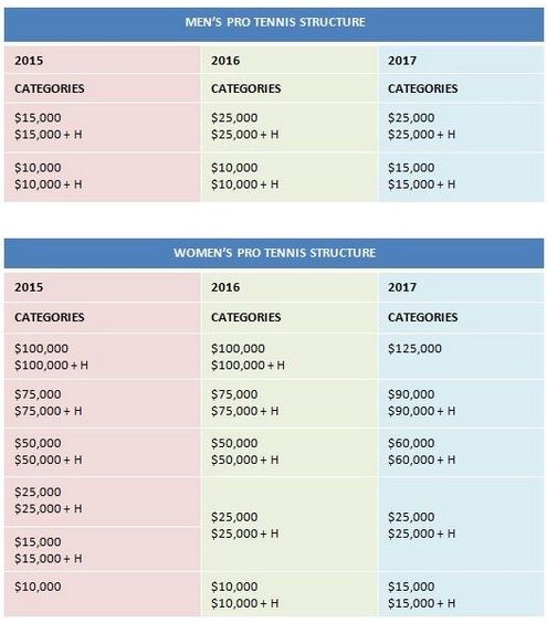 Il Consiglio d'Amministrazione dell'ITF ha approvato l'aumento dei montepremi per i tornei di fascia inferiore. In campo maschile, l'egida dell'ITF si limita ai tornei futures, mentre tra le donne abbraccia una categoria di tornei più ampia. Partiamo dagli uomini: dall'anno prossimo, i tornei da 15.000 dollari passeranno a 25.000 (con o senza ospitalità), mentre il passaggio dei 10.000 a 15.000 avverrà soltanto nel 2017. In campo femminile, solito discorso per gli attuali 10.000, mentre i 15.000 si uniformeranno ai 25.000. Aumenti più sostanziosi per i tornei di maggior montepremi: i 50k diventeranno 60, i 75 passeranno a 90 e i 100 andranno a 125. Qui sotto, lo schema pubblicato dall'ITF che esplica i vari cambiamenti. . In campo maschile, l'egida dell'ITF si limita ai tornei futures, mentre tra le donne abbraccia una categoria di tornei più ampia. Partiamo dagli uomini: dall'anno prossimo, i tornei da 15.000 dollari passeranno a 25.000 (con o senza ospitalità), mentre il passaggio dei 10.000 a 15.000 avverrà soltanto nel 2017. In campo femminile, solito discorso per gli attuali 10.000, mentre i 15.000 si uniformeranno ai 25.000. Aumenti più sostanziosi per i tornei di maggior montepremi: i 50k diventeranno 60, i 75 passeranno a 90 e i 100 andranno a 125. Qui sotto, lo schema pubblicato dall'ITF che esplica i vari cambiamenti.