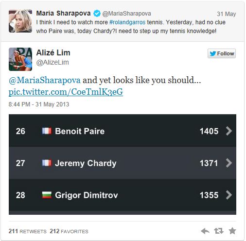 Alize Lim, discreta giocatrice francese e fidanzata di Jeremy Chardy, ha difeso il suo ragazzo via Twitter…dall'ignoranza di Maria Sharapova. La russa, infatti, aveva scritto di non aver mai sentito nominare Paire e Chardy prima di averli visti all'opera al Roland Garros. "Penso di aver bisogno di vedere più tennis. Ieri non avevo idea di chi fosse Paire. E oggi Chardy? Devo migliorare la mia conoscenza del tennis". La Lim ha risposto, pubblicando la classifica ATP che vede Paire al numero 26, Chardy al numero 27…e Grigor Dimitrov, fidanzato della Sharapova, in 28esima posizione. In tempi di comunicazione sfrenata, l'ignoranza è un lusso che non ci si può permettere! . La russa, infatti, aveva scritto di non aver mai sentito nominare Paire e Chardy prima di averli visti all'opera al Roland Garros. "Penso di aver bisogno di vedere più tennis. Ieri non avevo idea di chi fosse Paire. E oggi Chardy? Devo migliorare la mia conoscenza del tennis". La Lim ha risposto, pubblicando la classifica ATP che vede Paire al numero 26, Chardy al numero 27…e Grigor Dimitrov, fidanzato della Sharapova, in 28esima posizione. In tempi di comunicazione sfrenata, l'ignoranza è un lusso che non ci si può permettere!