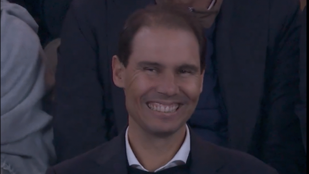 Il campione spagnolo era in tribuna ad assistere al match, con Nole che dopo aver giocato un punto a ironicamente chiesto al suo amico e rivale se volesse scendere in campo