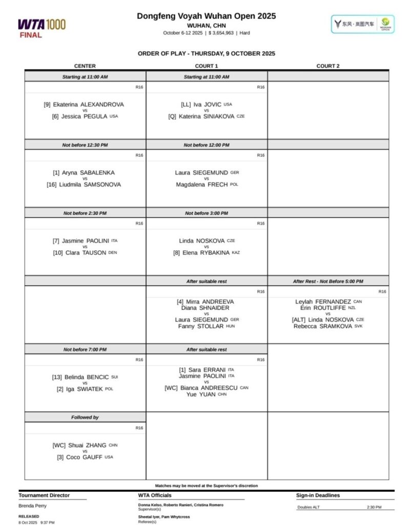 Sarà un giovedì importante per le sorti della stagione di Jasmine Paolini, specialmente per quanto riguarda il singolare e la lotta per la qualificazione alle WTA Finals di Riyadh. La toscana è in pienissima lotta con Elena Rybakina e in questo momento nella race è balzata davanti con 3861 punti contro i 3818 della kazaka. Oggi Paolini affronta Clara Tauson in un match sicuramente non semplice che si giocherà non prima delle 8.30 sul Campo Centrale, dopo Sabalenka-Samsonova. Rybakina sarà invece impegnata sul Campo 1 non prima delle 9.00 contro Linda Noskova. Paolini che poi tornerà in campo anche in doppio per affrontare insieme a Sara Errani Andreescu e Yuan.